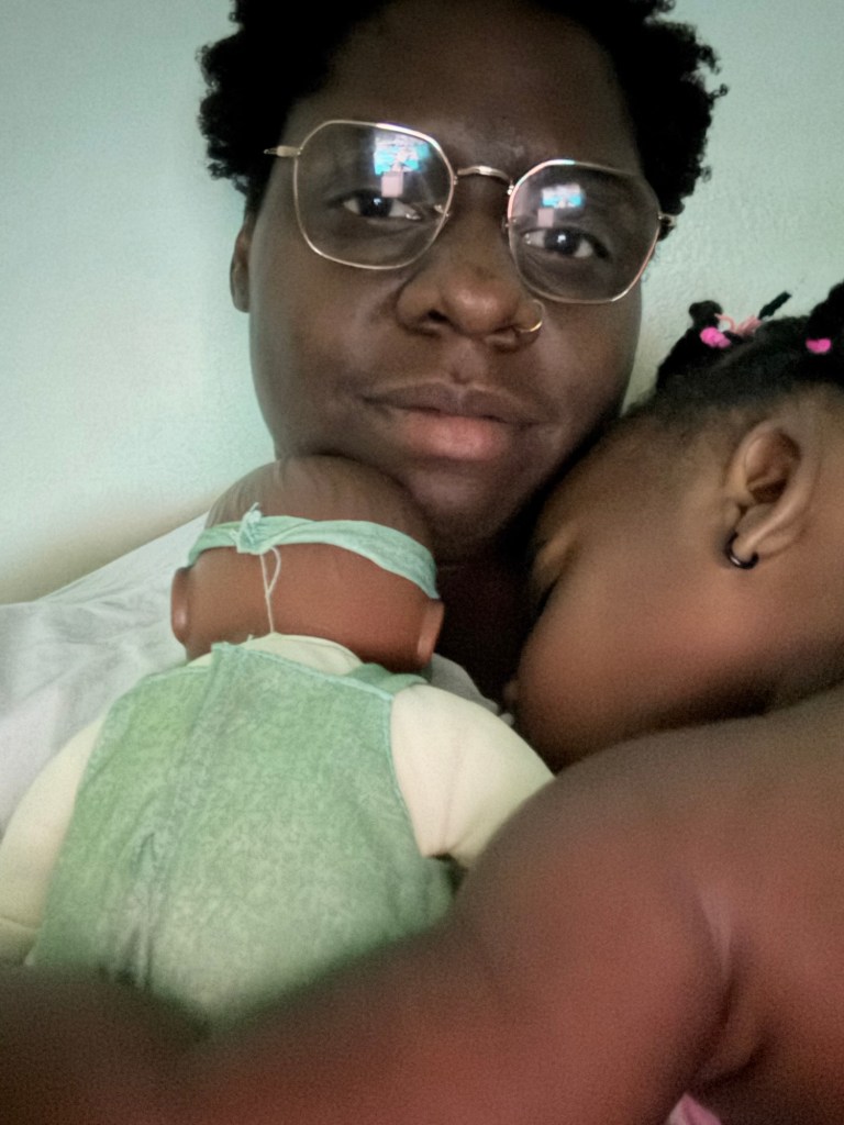 Since we’ve been home her baby has barely left her side. I usually hold my Zoya as she sleeps, but she prefers to lay in the bed on her own and hold her baby. It was very sweet to witness, but also bittersweet for me seeing my baby grow up. And finding her little spaces of independent.